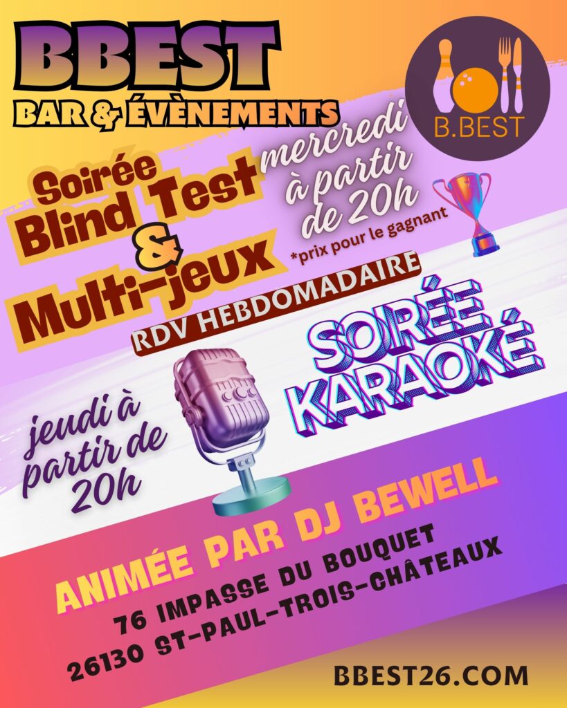 Rasso de Noël Rassemblement de Voitures & Motos Le Dimanche 7 décembre à partir de 14h Venez nombreux le dimanche 7 décembre de 14h à 23h au BBEST ! Gros rassemblement de Noël avec récolte de jouets au profit de l’association Madysson’s Hope (les enfants aux hôpitaux). *Présenté par l’association Rasso au Féminin et BBEST* PROGRAMME : ~ Rassemblement de voitures & motos décorées à thème à partir de 14h~ Concert~ Tombola de Noël~ Tatouage (flash) & piercings sur place~ Mini marché de Noël~ Restauration & Bar~ Salles de jeux~ Vin chaud BBEST BAR & ÉVÈNEMENTS76 Impasse du Bouquet, 26130 St-Paul-Trois-Châteauxbbest26.com | FB : bbestbowling | INSTA : bbest26france ASSOCIATION RASSO AU FÉMININFB | INSTA : rassoaufemininrassoaufeminin@gmail.com
