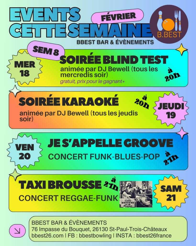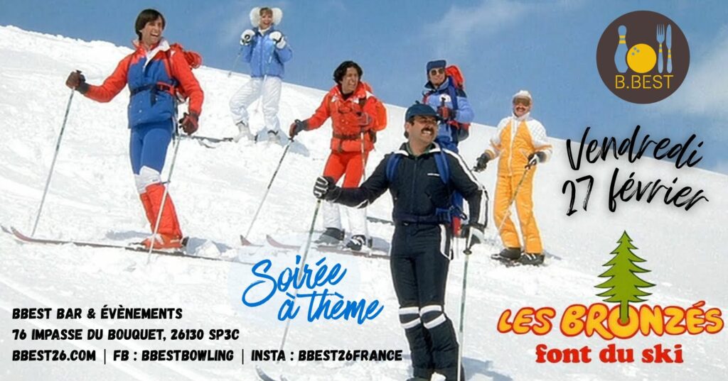Soirée les Bronzés font du ski Le Vendredi 27 février à partir de 21h Venez profiter d’une soirée du « ski » au BBEST ! DJ Bewell sera sur les platines pour jouer la musique iconique des films et des extraits sur tous les écrans pour votre plaisir. Cocktails spéciaux, déguisements de ski, des « personnages » et des goodies, allez !