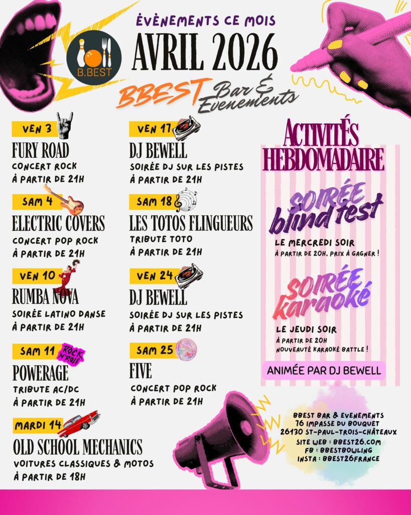 Fury Road Concert Rock Le Vendredi 3 avril à partir de 21h Fury Road a sorti leur premier album en mars 2025 (voir ci-dessous l’article publié sur francebleu.fr pour plus d’infos), mais bien avant cela, le groupe s’était déjà fait connaître dans le monde entier grâce à leur talent musical et leur créativité. Nous sommes heureux de les accueillir à nouveau le samedi 15 novembre pour une soirée rock ‘n’ roll inoubliable. Vous entendrez de plus en plus parler d’eux, alors ne ratez pas cette occasion de les voir localement au BBEST ! *pas besoin de réserver A PROPOS (extrait d’un article publié sur francebleu.fr) : « Le nom du groupe est une invitation au voyage, aux grands espaces, aux autoroutes du grand Ouest : FURY ROAD, sous-titre de Mad Max 4, le film de George Miller, sorti en 2015. Le ciné nourrit l’imaginaire, c’est bien connu. Un imaginaire nourri depuis le grand nord du Gard en ce qui concerne ces quatre garçons élevés au bon vieux rock des familles. Faire du rock en 2025, à l’ère du rap triomphant, c’est déjà un sacré challenge. Si les maisons de disque ont baissé le rideau depuis longtemps à tous les nostalgiques du combo basse-batterie-guitare, une poignée d’irréductibles résiste ! *Quatre garçons dans le Mistral* Eh oui, le Mistral souffle parfois très fort à Alès et il inspire la bande de quadras emmenée par Benjamin SABRAN, au chant et à la guitare. Des guitares, il y en a deux dans FURY ROAD, histoire d’envoyer un gros son bien dense. Pour le premier album du groupe, à paraître le 5 mars, ce gros son bien dense a été travaillé au studio Belvédère de Montagnac. Le mixage et le mastering des 9 titres a été réalisé par une pointure du genre : Adrien THORE qui a travaillé, entre autres, pour Vanessa Paradis et Matthieu Chedid. Un travail de qualité pour partir à la conquête des oreilles les plus affûtées. » DÉCOUVREZ :https://thefuryroad.fr/https://www.facebook.com/thefuryroadbandhttps://www.instagram.com/the.furyroad/ https://www.youtube.com/channel/UCdR0RkRBoM5eGNKeH6Cs0YA