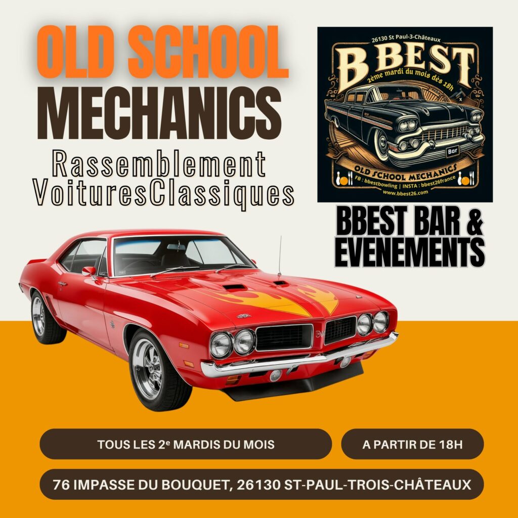 Old School Mechanics Rassemblement Voitures Anciennes Le Mardi 14 avril à partir de 18h Sortez votre ancienne classique et venez partager au BBEST dès 18h ! Parking éclairé et toujours un verre de bière pression 25cl offert aux propriétaires de vielles mécaniques.