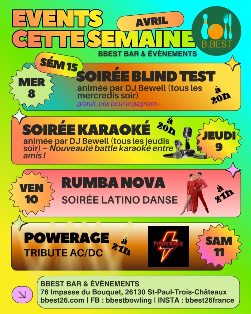 Soirée Latino avec Rumba Nova Soirée Latino Le Vendredi 10 avril à partir de 21h BBEST vous présente la série mensuelle de musique latine et de danse avec l’incroyable groupe, Rumba Nova ! Laissez-vous séduire par les sonorités de ce groupe dynamique, composé d’un mélange de musiciens et chanteurs espagnols et français. La soirée vous offrira certainement de la musique puissante remplie de feu de l’émotion, et la sensualité de la danse latine, chemin qui explore l’âme et le cœur !