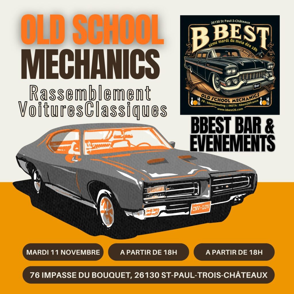 Old School Mechanics Rassemblement Voitures Anciennes Le Mardi 11 novembre à partir de 18h Sortez votre ancienne classique et venez partager au BBEST dès 18h !Oui, nous sommes ouverts le mardi 11 novembre (l’Armistice). On vous attend ! Parking éclairé et toujours un verre de bière pression 25cl offert aux propriétaires de vielles mécaniques.