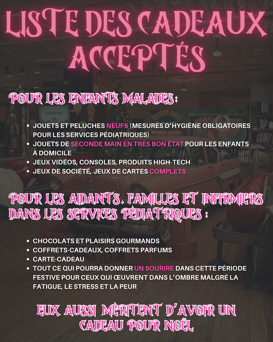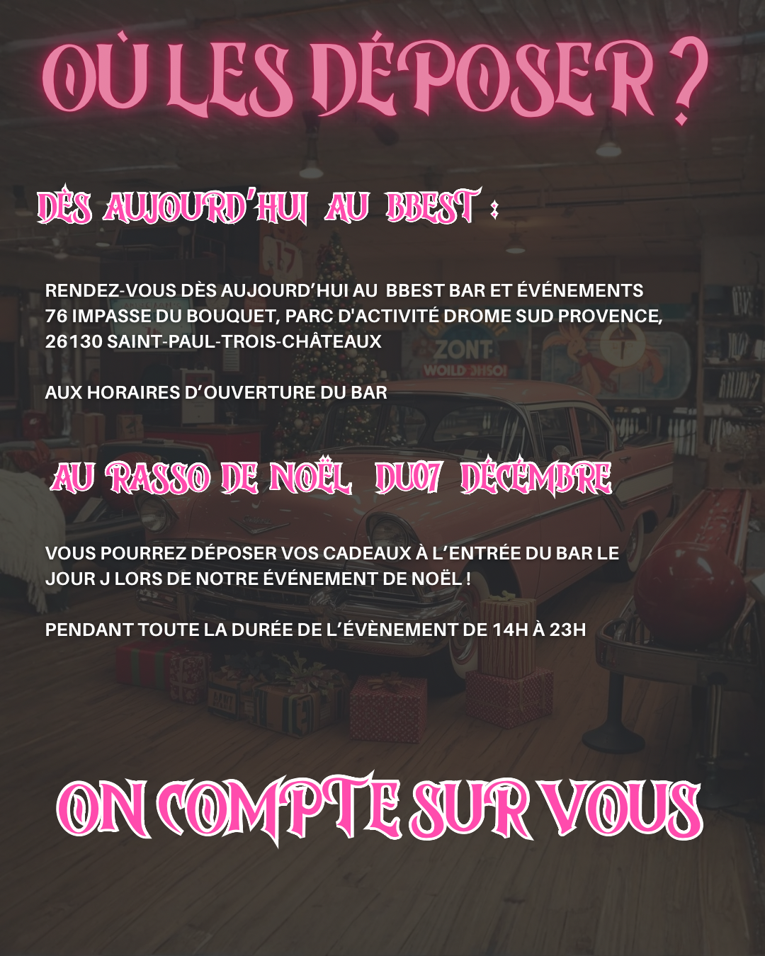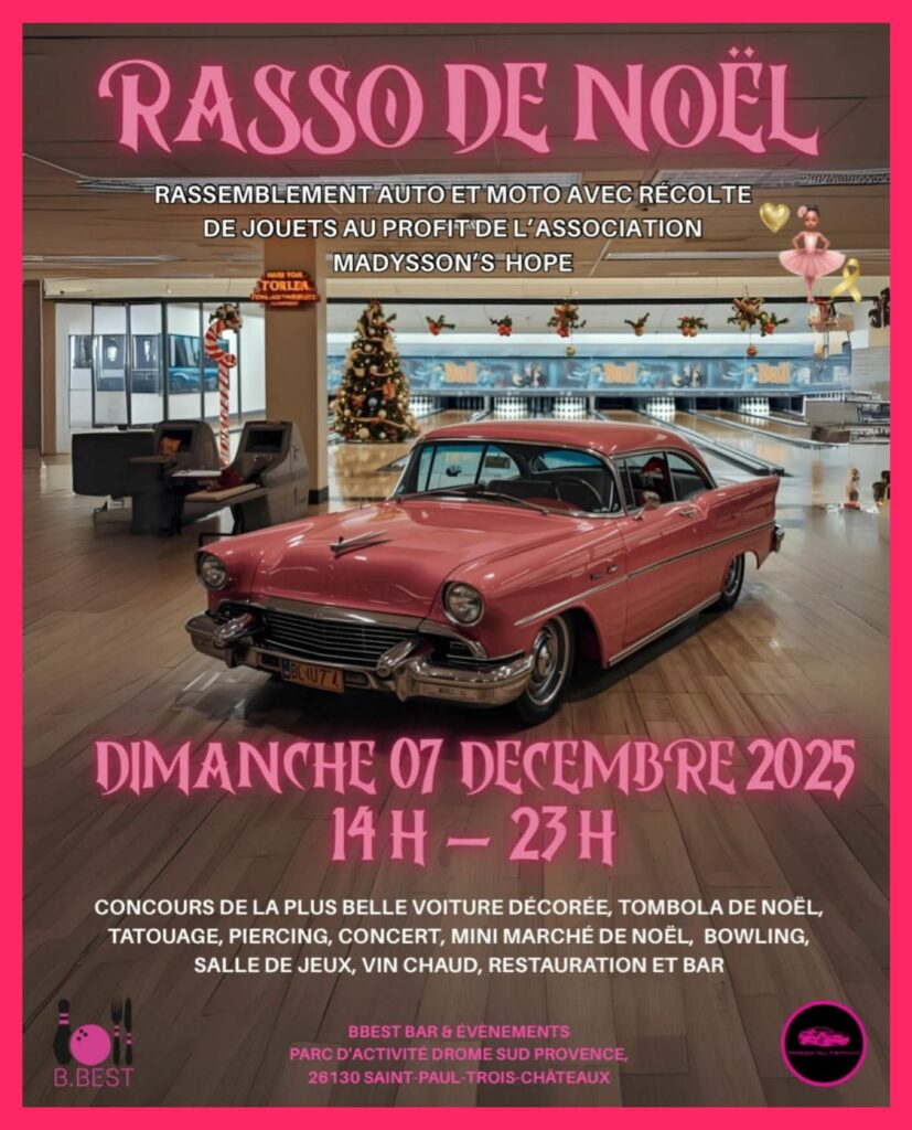 Rasso de Noël Rassemblement de Voitures & Motos Le Dimanche 7 décembre à partir de 14h Venez nombreux le dimanche 7 décembre de 14h à 23h au BBEST ! Gros rassemblement de Noël avec récolte de jouets au profit de l’association Madysson’s Hope (les enfants aux hôpitaux). *Présenté par l’association Rasso au Féminin et BBEST* PROGRAMME : ~ Rassemblement de voitures & motos décorées à thème à partir de 14h~ Concert~ Tombola de Noël~ Tatouage (flash) & piercings sur place~ Mini marché de Noël~ Restauration & Bar~ Salles de jeux~ Vin chaud BBEST BAR & ÉVÈNEMENTS76 Impasse du Bouquet, 26130 St-Paul-Trois-Châteauxbbest26.com | FB : bbestbowling | INSTA : bbest26france ASSOCIATION RASSO AU FÉMININFB | INSTA : rassoaufemininrassoaufeminin@gmail.com